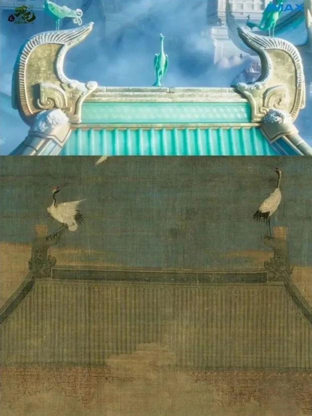 玉虚宫的外景一出,引得观众连呼“好美”。它的色彩与布局,是对宋徽宗名画《瑞鹤图》的致敬。
