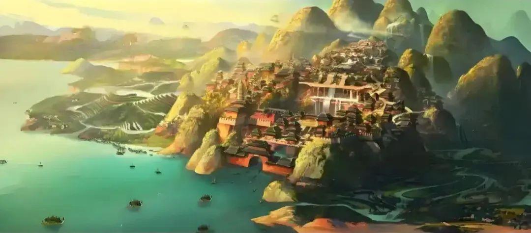 充满奇幻色彩的陈塘关风光,设计时借鉴了广西桂林的山水景观。