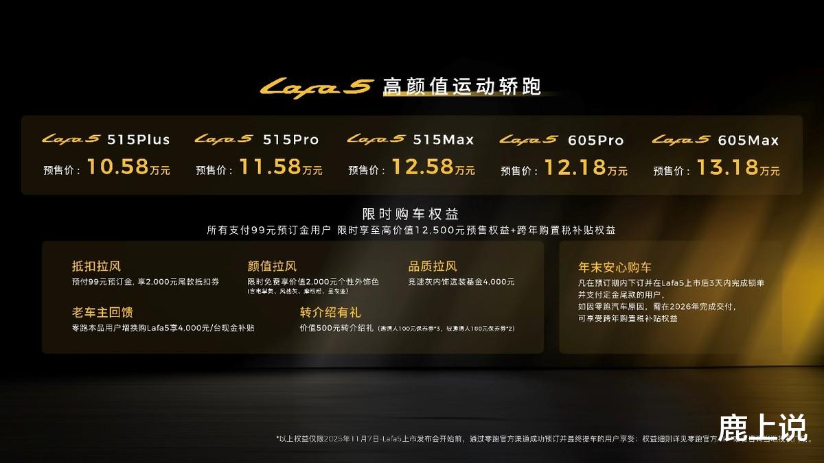 预售权益方面,2025年11月7日至零跑Lafa5上市发布会前,预付99元预订金,限时享至高价值12500元预售权益+跨年购置税补贴权益。